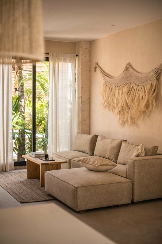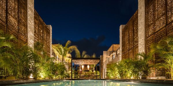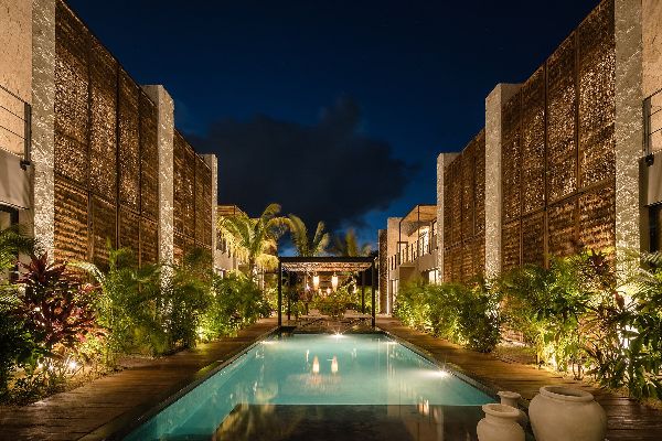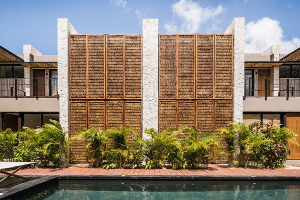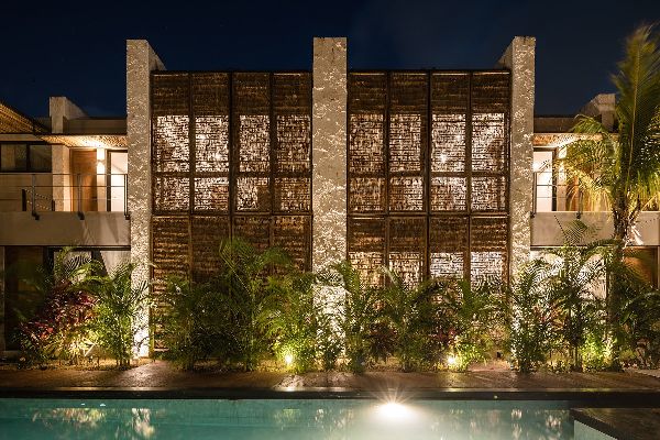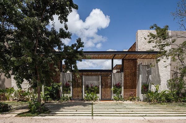 這個外墻是由巨大的、可操作的百葉窗組成的,可以根據居住者的需要折疊打開或關閉。這是一種內在的狀態的表達,表達了使用者的當時的情況。除了當地的藤蔓植物,該團隊還利用了該地區的各種材料。這些材料包括藤條、“瑪雅景觀采石場”、Chukum灰泥和Parota木材。該團隊繼續說:“它的設計、材料的選擇、色調和植被尋求產生一個平靜和和平的空間。該項目探索了內部和外部、社區和私人空間的持續關系,照顧到了與周圍環境的輕松和尊重的氛圍”。