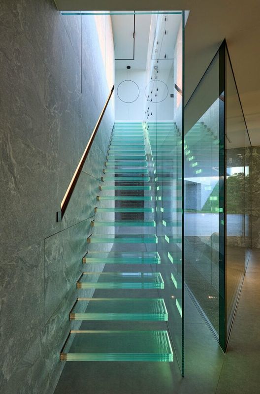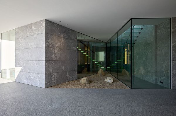 河邊看,建筑師把臥室放在右邊的部分;中間是帶廚房的客廳,左邊是娛樂室。同樣值得注意的是,在一層樓高的房頂上放置了一個釉面矩形盒子。它像一個潛望鏡,可以俯瞰周圍的樹冠。房子有兩個游泳池,包括一個室內游泳池和兩個外部泳池,還有一個300米長的跑道和一個可以與山腳自由交流的移動平臺。房屋有多種自動化設備,再加上創新的技術解決方案,保證房屋的舒適度。