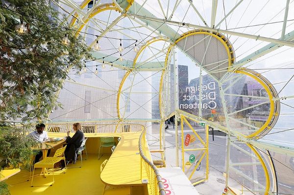 塞爾加斯卡諾設(shè)計(jì)的新建筑,位于倫敦的設(shè)計(jì)區(qū)(裝逼區(qū))的食堂,它采用透明的結(jié)構(gòu),位于格林威治半島的主要行人通道上,讓當(dāng)?shù)厝撕陀慰瓦M(jìn)入其充滿光亮的圓頂狀內(nèi)部,并以充滿活力的黃色為主色調(diào)。設(shè)計(jì)區(qū)食堂由輕金屬結(jié)構(gòu)、透明ETFE膜外殼和聚碳酸酯板組成。建筑形體像脊柱,其中有多個(gè)攤位和頂層的座位區(qū)。