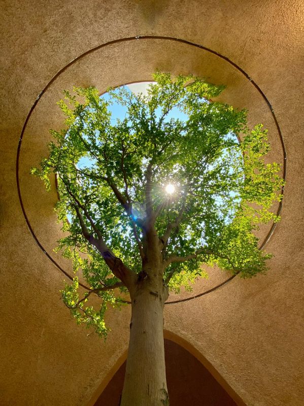 錐形結構圍繞著三個綠色庭院排列,房間的序列從充滿陽光的空間逐漸過渡到陰影空間,入口處有傾斜的拱門。