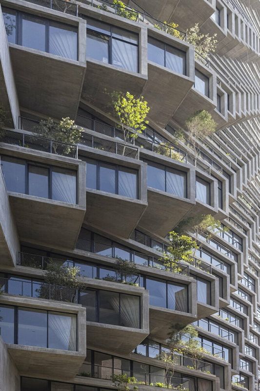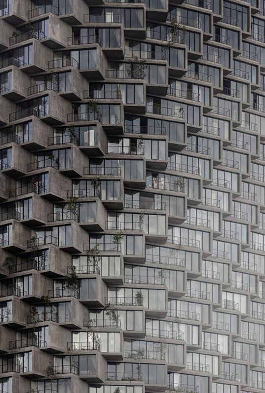 IQON中的每個住宅,都表現(xiàn)出對自然的熱愛。通過將雕塑般的花盆融入建筑。花盆在公寓內(nèi)成為一個獨特的混凝土雕塑,為上面的公寓露臺的樹根區(qū)創(chuàng)造了空間,同時將建筑的立面轉(zhuǎn)變?yōu)閷嗲啻涞纳锒鄻有员砥ぁ?/p>