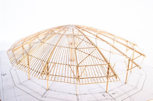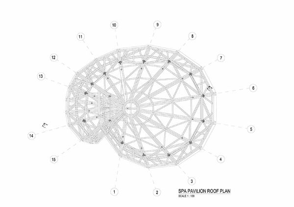 建筑群遵循由十四根柱子組成的計(jì)劃,這些柱子由耦合的桿子制成,并用傾斜的支撐物加固,在中央竹塔的幫助下減輕屋頂?shù)闹亓俊?屋頂結(jié)構(gòu)由十四根由三根桿組成的梁組成,徑向放置在垂直支架上。 五階線性檁條形成屋頂?shù)膱A形形狀,并為最后一層椽子提供支撐。 竹子交叉系統(tǒng)加固了結(jié)構(gòu),而懸掛在排水溝線上的天然印度尼西亞茅草“alang-alang”提供了遮陽(yáng)避雨的保護(hù),并形成了天篷的最終外觀。