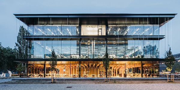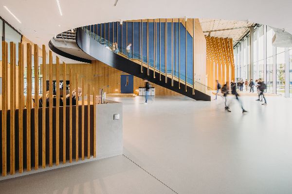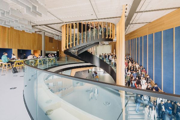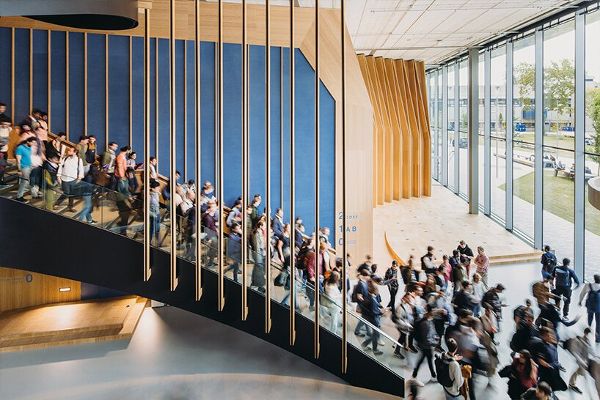 根據(jù)UNStudio的說(shuō)法,“面向未來(lái)”的校園是活躍的。也就是說(shuō),該建筑不僅尋求與周?chē)墓部臻g建立聯(lián)系,而且通過(guò)其透明的底層,變成了一個(gè)有蓋的公共廣場(chǎng),使無(wú)形的學(xué)習(xí)世界成為可見(jiàn)的、有吸引力的體驗(yàn)。