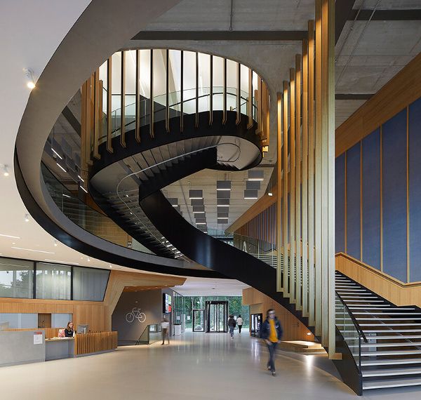宏偉的螺旋形樓梯占據(jù)室內(nèi)的中心位置,促進(jìn)了建筑中的交通,有助于用戶的健康。按照建筑師的意圖,該設(shè)計(jì)支持“一切皆有可能”的當(dāng)代文化。非常重視中間的空間,以及物理運(yùn)動(dòng)。該建筑為思考、靈感和交流提供了各種平臺(tái)。