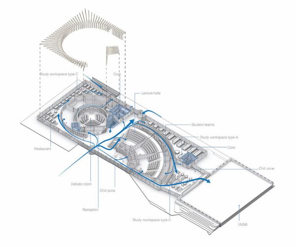 Ben van Berkel評(píng)論道:“與在筒倉(cāng)中運(yùn)作的傳統(tǒng)校園不同,未來(lái)的校園需要用敏捷的空間進(jìn)行編程,邀請(qǐng)學(xué)生和教師學(xué)習(xí)、協(xié)作和共同創(chuàng)造。隨著學(xué)生人數(shù)的不斷增加,教育建筑需要非常靈活,通過(guò)基于教師間共享的模式來(lái)運(yùn)作,從而促進(jìn)更多的通才教育”。