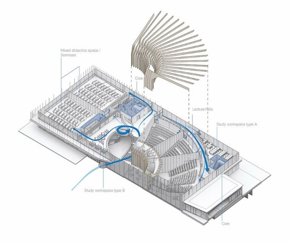 該建筑占地8844平方米,由教學(xué)空間組成,包括演講室、教室和各種學(xué)習(xí)空間,可容納約1700名學(xué)生。大多數(shù)空間提供了靈活的布局。例如,位于一樓的最大的演講室可以容納700人,在不到20分鐘的時(shí)間內(nèi)可以輕松地分成三個(gè)獨(dú)立的房間。這促進(jìn)了多個(gè)講座或活動(dòng)的同時(shí)進(jìn)行,并實(shí)現(xiàn)了空間的最大規(guī)劃。各種教學(xué)室都是根據(jù)講師和學(xué)生當(dāng)前和未來(lái)的需要而設(shè)計(jì)的。