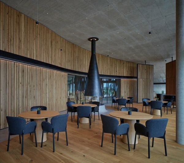 據設計團隊介紹,雖然該酒莊采用了傳統的地面設置,但其建筑概念體現了現代和永恒的本質。場所內的氣氛概括了美麗、優雅和絕對的舒適。材料的選擇,包括裸露的混凝土、玻璃、金屬以及橡木和洋槐木,創造了一種整齊和直接的美感,與建筑的有機形式相得益彰。每一個細節都是精心制作的,確保精確和質量。得益于廣闊的玻璃表面、寬敞的露臺和傾斜的屋頂,該酒莊與周圍的風景建立了直接的聯系。這種整合允許多樣化的自然體驗,捕捉到空間內不斷變化的情緒和季節。