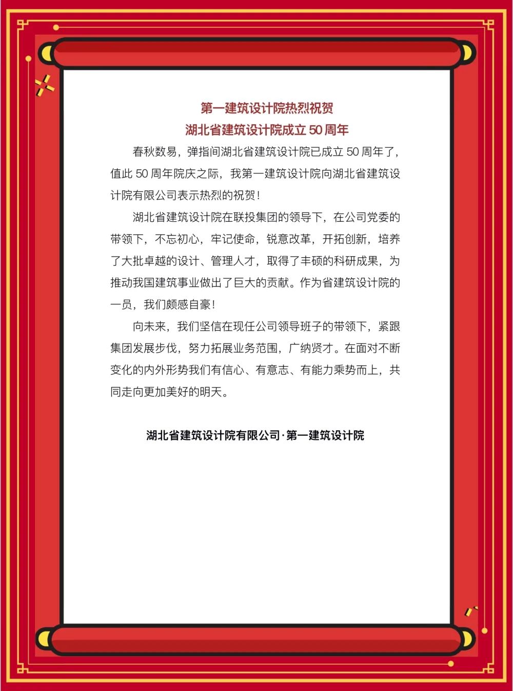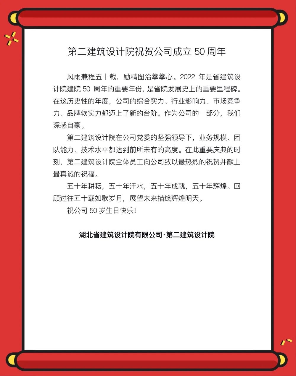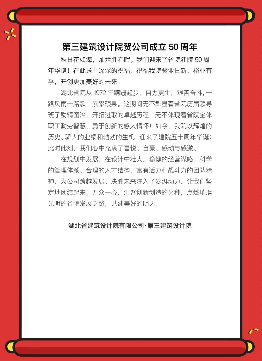 2022年,湖北省建筑設計院有限公司成立50周年。50載長歌奮進、50載砥礪前行,實現了省院從“標準設計站”到綜合型設計院的華麗蝶變,省院的每一步,都烙上了艱辛與榮耀的印記,每一次蛻變都離不開一代代HBADI人的嘔心瀝血、奮發圖強。