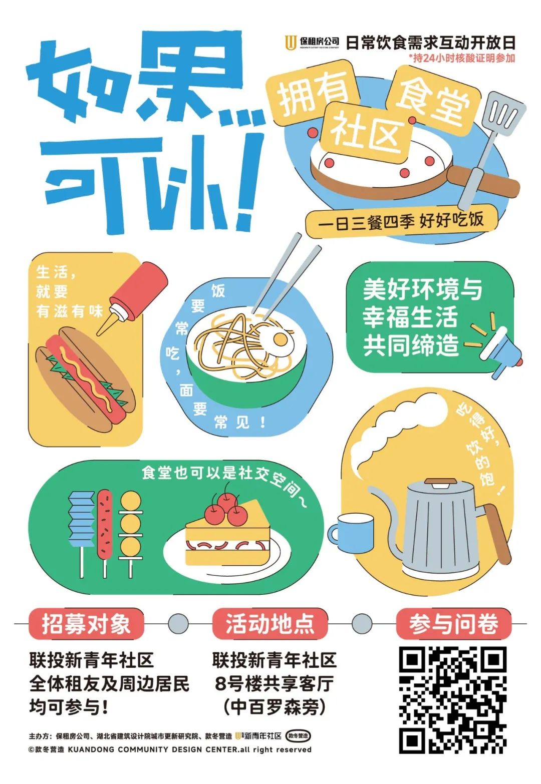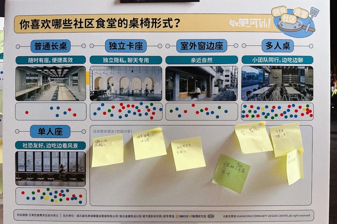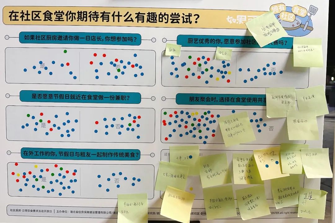 作為社區公共空間,如果食堂只在就餐時間段使用,會造成空間的浪費。就餐時間外如能舉辦社群活動,就能更好地利用空間價值。在參與式設計互動中,我們和租友一起提出了美食活動的好點子,如舉辦社區廚房一日店長、社區廚藝大賽、食堂兼職或是節假日與朋友一起做家鄉美食等有趣的活動,為青年租友提供社交與承載興趣愛好的場所,期待值拉滿。