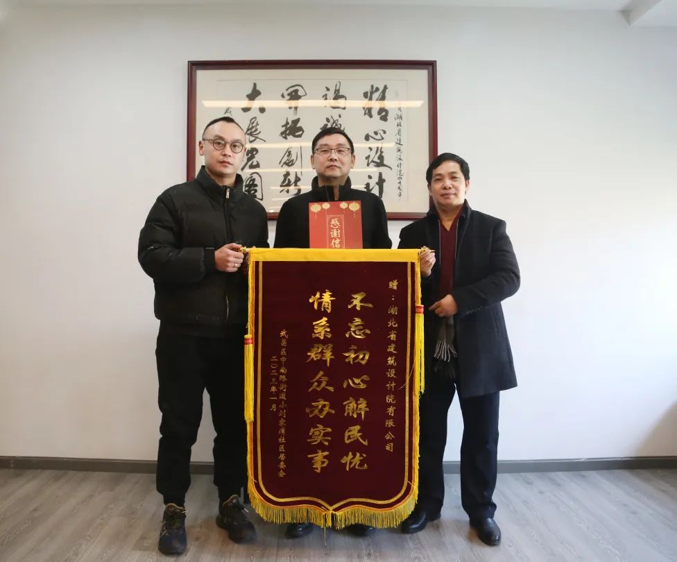 ??“感謝湖北省建筑設計院有限公司對我們社區工作的大力支持,為我們廣大社區群眾筑牢了安全防線。我們代表小劉家灣社區黨委向貴公司表示崇高的敬意和衷心的感謝。”1月17日上午,省建筑設計院所在轄區小劉家灣社區書記湯赫、副書記陳嫻為公司送來了錦旗,感謝公司對社區工作的大力支持和幫助。